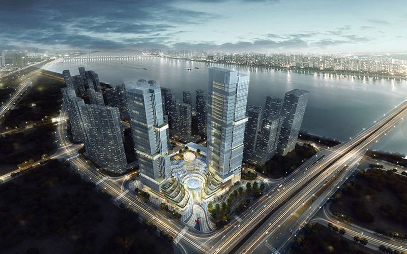 该项目主要建设办公写字楼、商业、餐饮等,地上总建筑面积182300m²,地下总建筑60000m²。项目由1#~5#楼五栋建筑组成,其中1#、2#为超高层建筑,1#塔楼高度211.66m,2#塔楼高度191.60m,均为框筒结构(型钢混凝土组合结构)。1#裙楼、2#裙楼、3~5号楼为混凝土框架结构,各结构间以钢结构连廊连接。